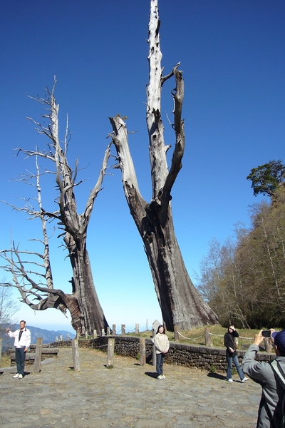在阿里山公路上,之前因為森林大火,所以附近的大樹都被燒光了,不過卻獨獨留下這兩棟樹,所以被稱為夫妻樹。